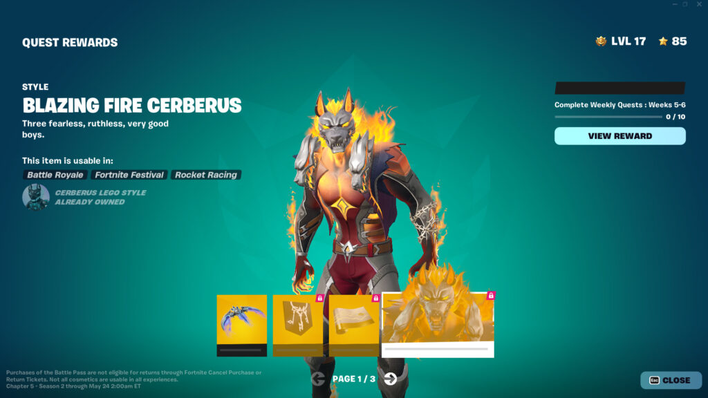 - Reward #4 – Blazing Fire Cerberus Alt Style (Complete 10 Quests in Weeks 5/6)