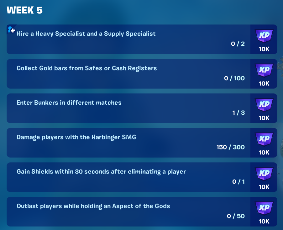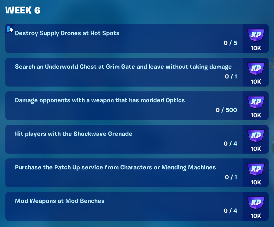 Above, you will find a list of all Week 5 and 6 Quests. These vary from entering Weapon Bunkers to modding weapons at Mod Benches. Once you start completing these challenges, they will count toward claiming the Quest Rewards in Fortnite.