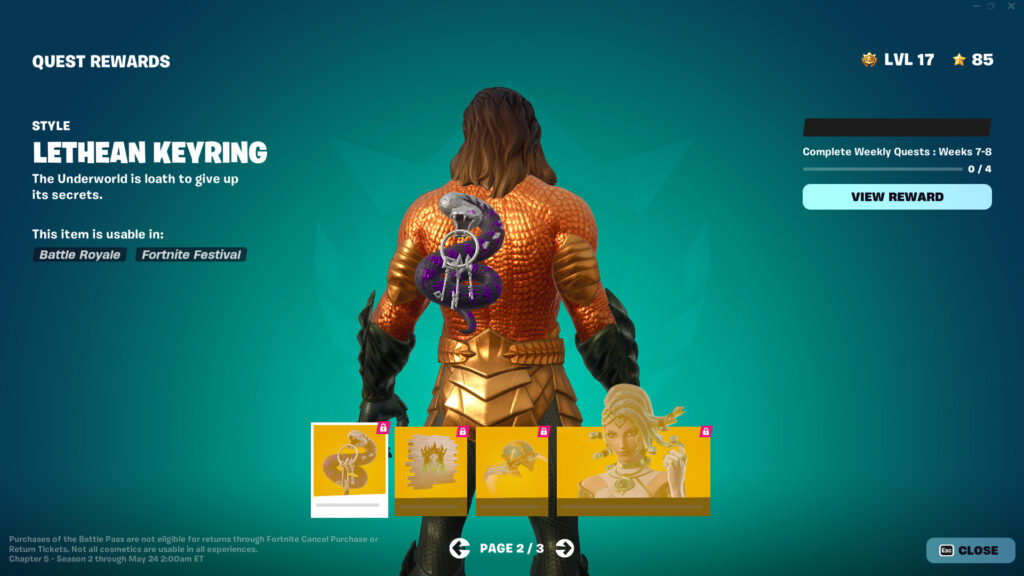 - Reward #1 – Lethean Keyring Back Bling (Complete 4 Quests in Weeks 7/8)
