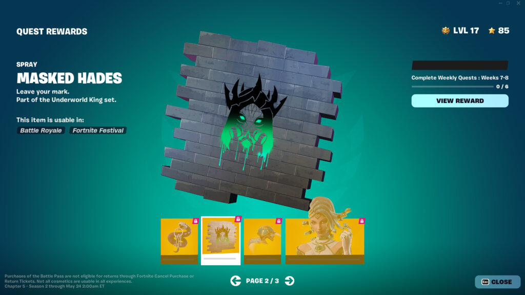 - Reward #2 – Masked Hades Spray (Complete 6 Quests in Weeks 7/8)