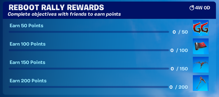 Four cosmetic items are unlockable via this season’s Reboot Rally in Fortnite: a Wrap, Emoticon, Glider, and Pickaxe. You must accumulate 200 points to secure all four of the rewards.