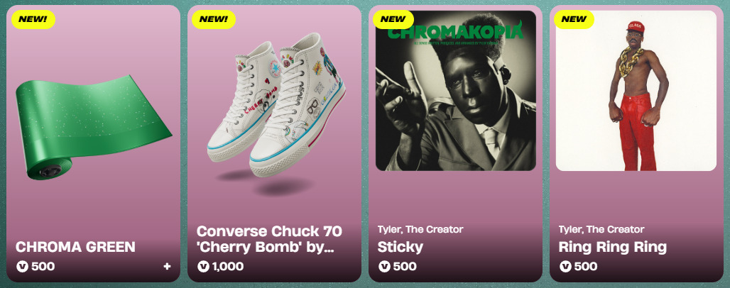 There’s much more as well, including Wraps, Back Blings, Emotes, and Instruments you can use in the Fortnite Festival game mode. Here is a complete list with prices for the Fortnite x Tyler, the Creator crossover: