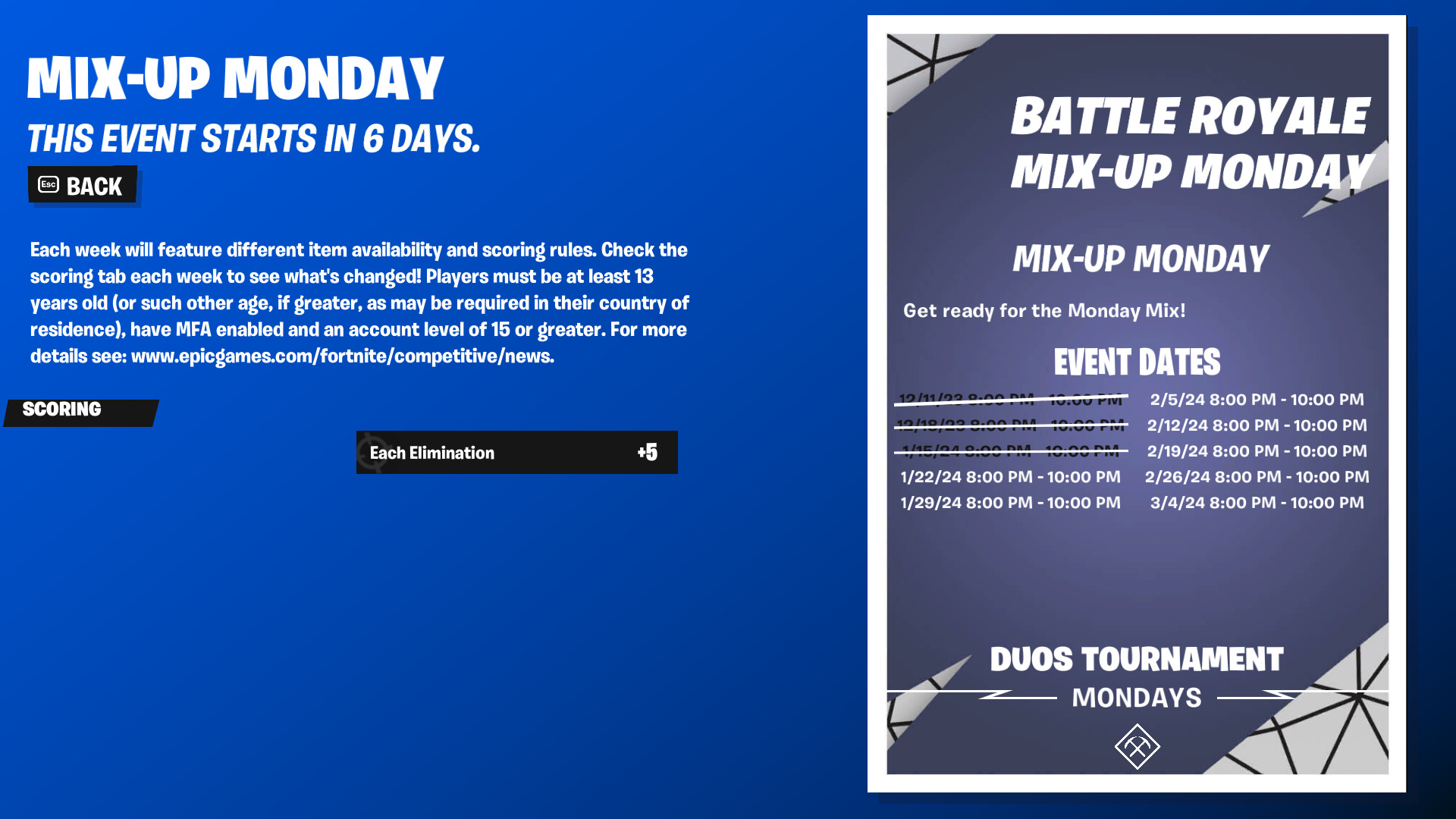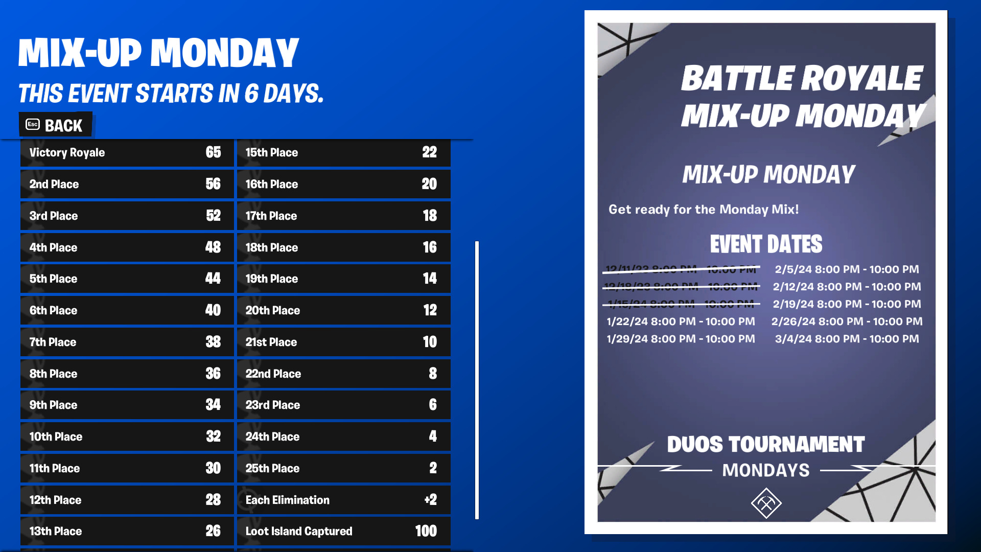 Mix Up Monday tournaments in Fortnite occur every Monday across all competitive regions. There are two tracks available: one for Zero Build and another for Battle Royale. The “Mix Up” aspect of the competition lies within the format, scoring system, and rules.