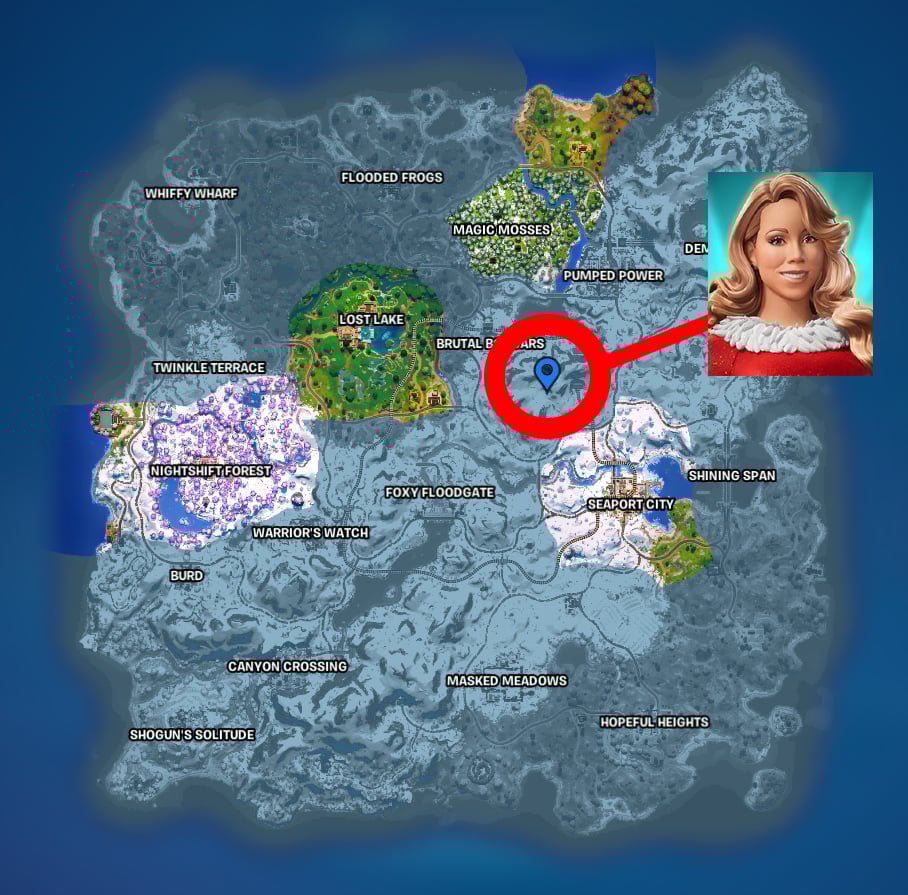 The Mariah Carey Fortnite NPC spawns in the snowy mountains southeast of Brutal Boxcars, as marked on the map above. This location is where she emerged from an ice block to open the Winterfest 2024 event officially. Surrounding the Mariah Carey NPC are some festive trees, presents, and other decorations.