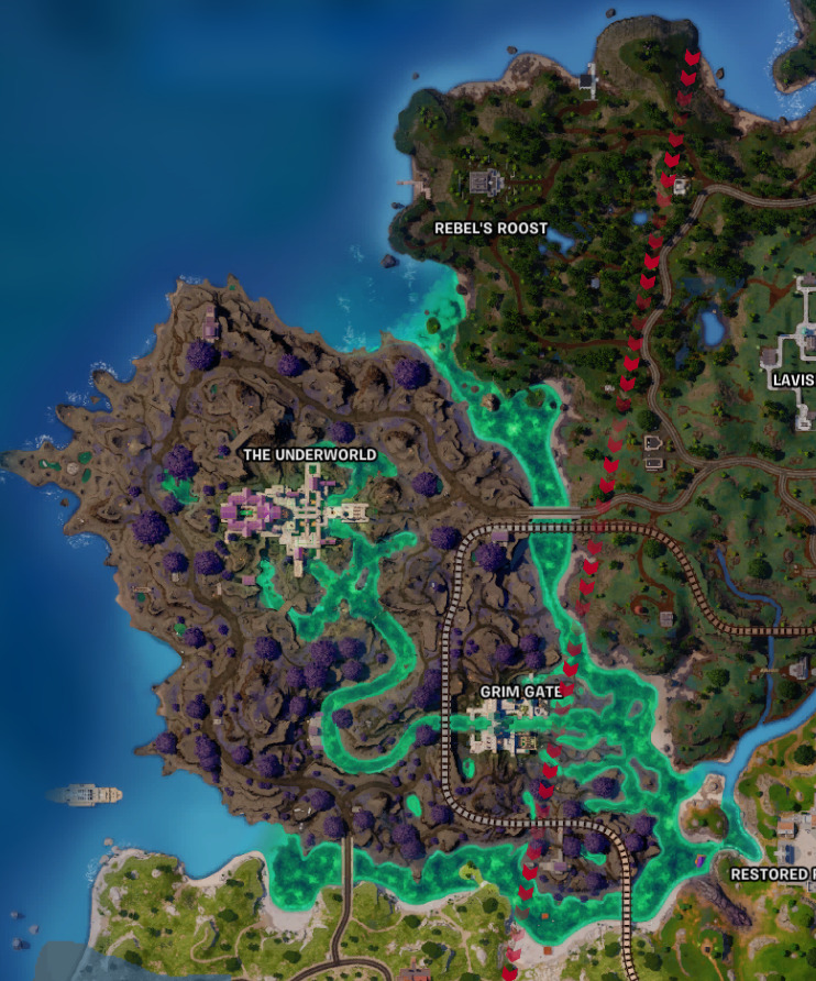 The River Styx in Fortnite surrounds The Underworld and Grim Gate area of the Chapter 5 Season 2 map. You can quickly identify what constitutes the river by looking at the green rivers. What you will notice is that it is only present in this spot, so this is your first stop if you plan to complete the Rise of Midas Quest.