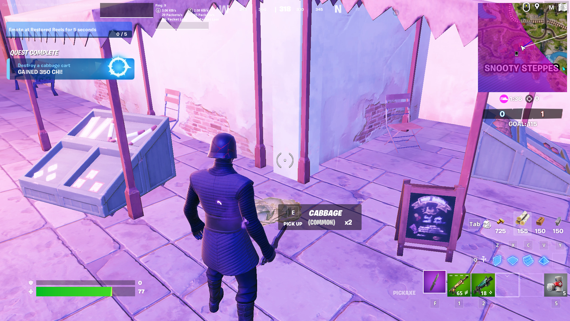You can quickly complete this Quest to destroy a cabbage cart by landing on one and using your Pickaxe or any weapon to break it. It may sound simple, and that’s because it is. Destroying a cabbage cart in Fortnite requires just two Pickaxe swings. Once that’s done, a collection of consumable cabbages will fall to the ground.