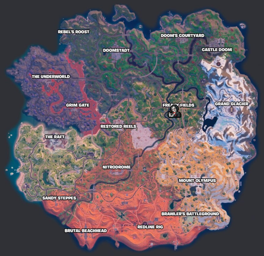 You can locate Billy in the Freaky Fields point of interest (POI), as marked on the map above, via Fortnite.GG. Once landing at this location, head into the main house, which you will find on the western side. After proceeding through the main door, you will see an old television set with the iconic Billy the Puppet on the screen.