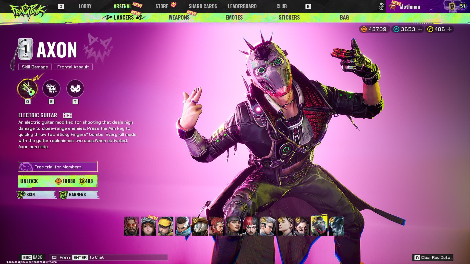 - Electric Guitar: An electric guitar modified for shooting that deals high damage to close-range enemies. Press the Aim key to quickly throw two Sticky Fingers bombs. Every kill made with the guitar replenishes two uses. When activated, Axon can slide.