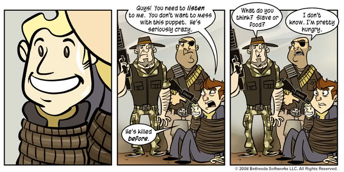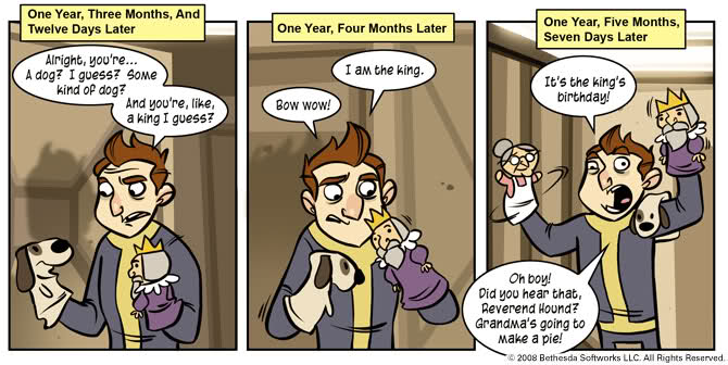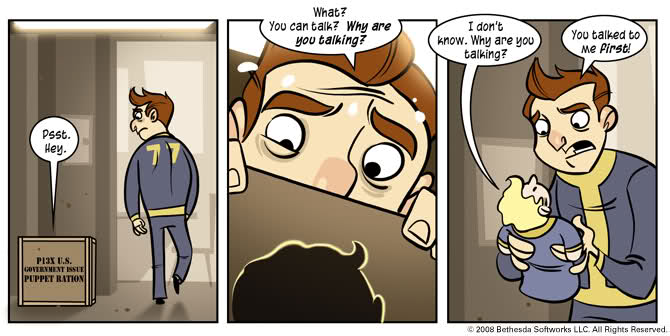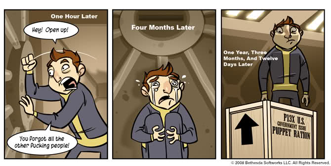 Vault 77 has its own comic strip detailing exactly what happened inside. The unnamed Vault dweller was locked in Vault 77 completely alone. A year, three months and 12 days pass before he pops open the “Puppet Ration” box.