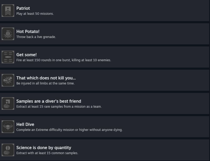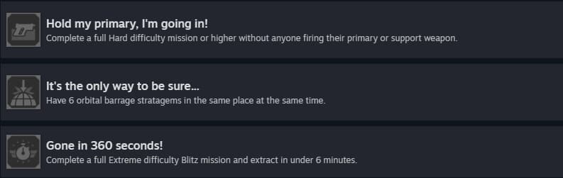 - Hold my primary, I’m going in! – Complete a full Hard difficulty mission or higher without anyone firing their primary or support weapon.