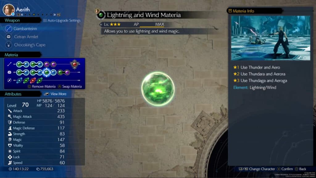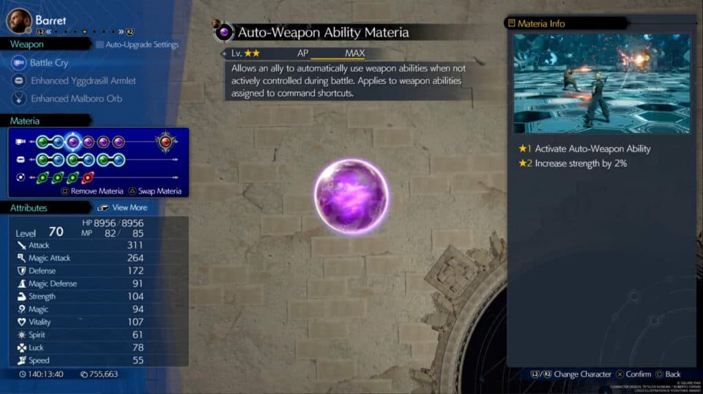 There are various types of Materia with different level caps, which requires AP (ability points) to level up. Materia with higher level caps need a lot more AP. Check out our FF7 Rebirth AP farming guide for a way to upgrade your Materia to the max level as fast as possible.