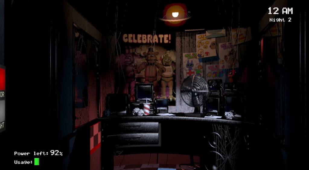 Ripped almost exactly from the first game, these two items appear in the restaurant’s security office. The Celebrate poster depicts Freddy, Bonnie, and Chica on stage as their in-game models. Alongside this entirely game-accurate prop is the red and white striped cup.