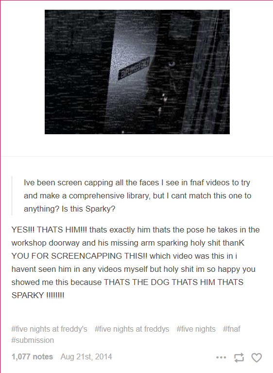 This long-running urban legend of the FNAF series is shown in both name and by a disused animatronic in the back of Freddy’s. The original rumor began with the first game, claiming that a secret animatronic named Sparky the Dog would kill the player under specific circumstances in-game.
