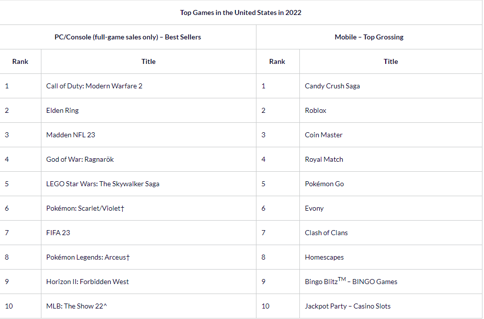 This includes an increase of content/software sales over prior years. For comparison, total sales of content in 2019 $37 billion, while that same number was $47.5 billion in 2022. Game sales are king, but which games specifically?