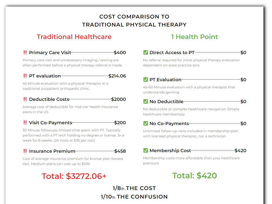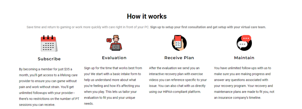 “It’s lets you see people in the environment they’re experiencing pain in.” To compare, an injury to a runner is easier to diagnose for a traditional provider because you can place them on a treadmill, have them run three miles, and then examine. However, 1HP wants to provide the same kind of care and assessment but for someone coming off of a five hour gaming session.