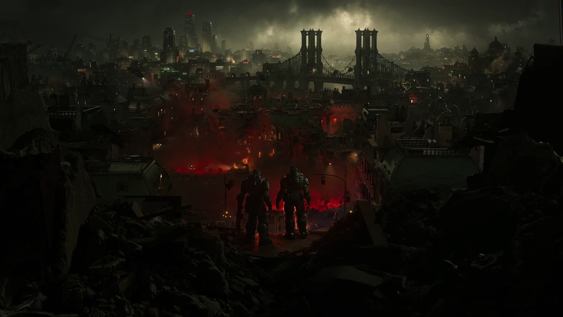 That hand belongs to none other than Dominic Santiago. He gives Marcus his bandana, and after he puts it back on, they look out into the city filled with war. The Locust have arrived on E-Day to begin the war we’ve seen throughout the Gears of War franchise.