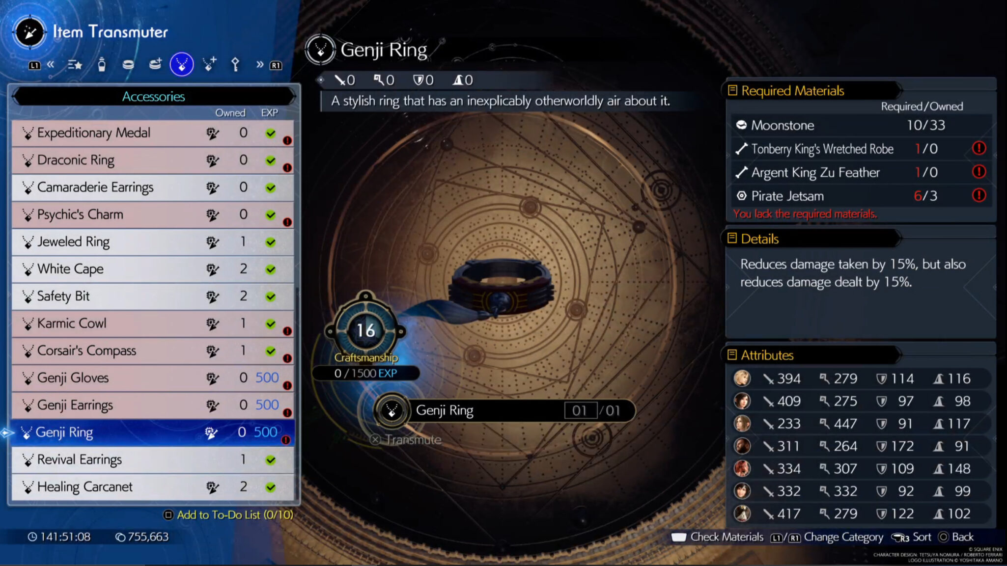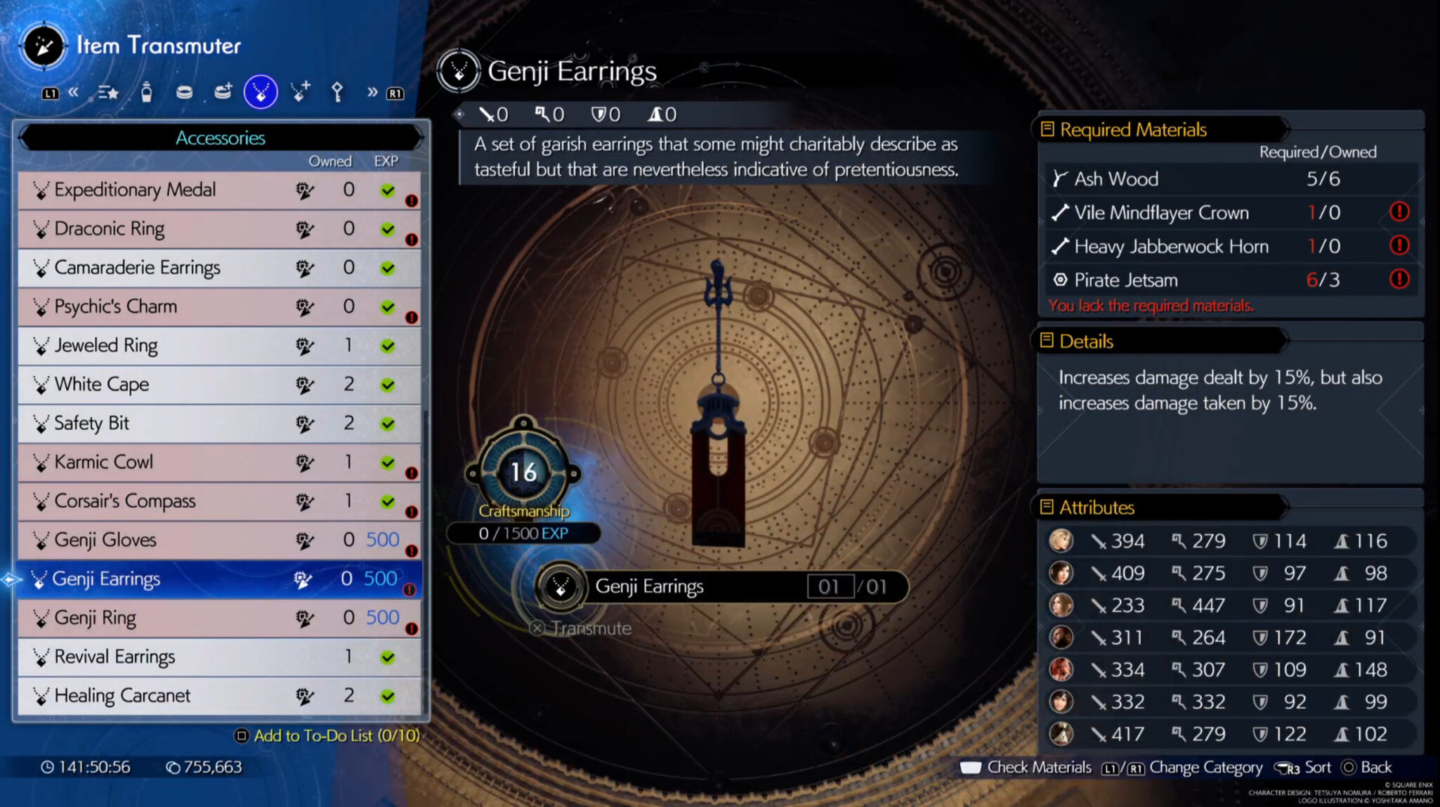 However, in order to craft the Genji accessories, you must first reach craftmanship level 16 by crafting every single Item Transmuter recipes once. You also need to gather resources that are only available in Hard Mode. The Genji recipes are as follows: