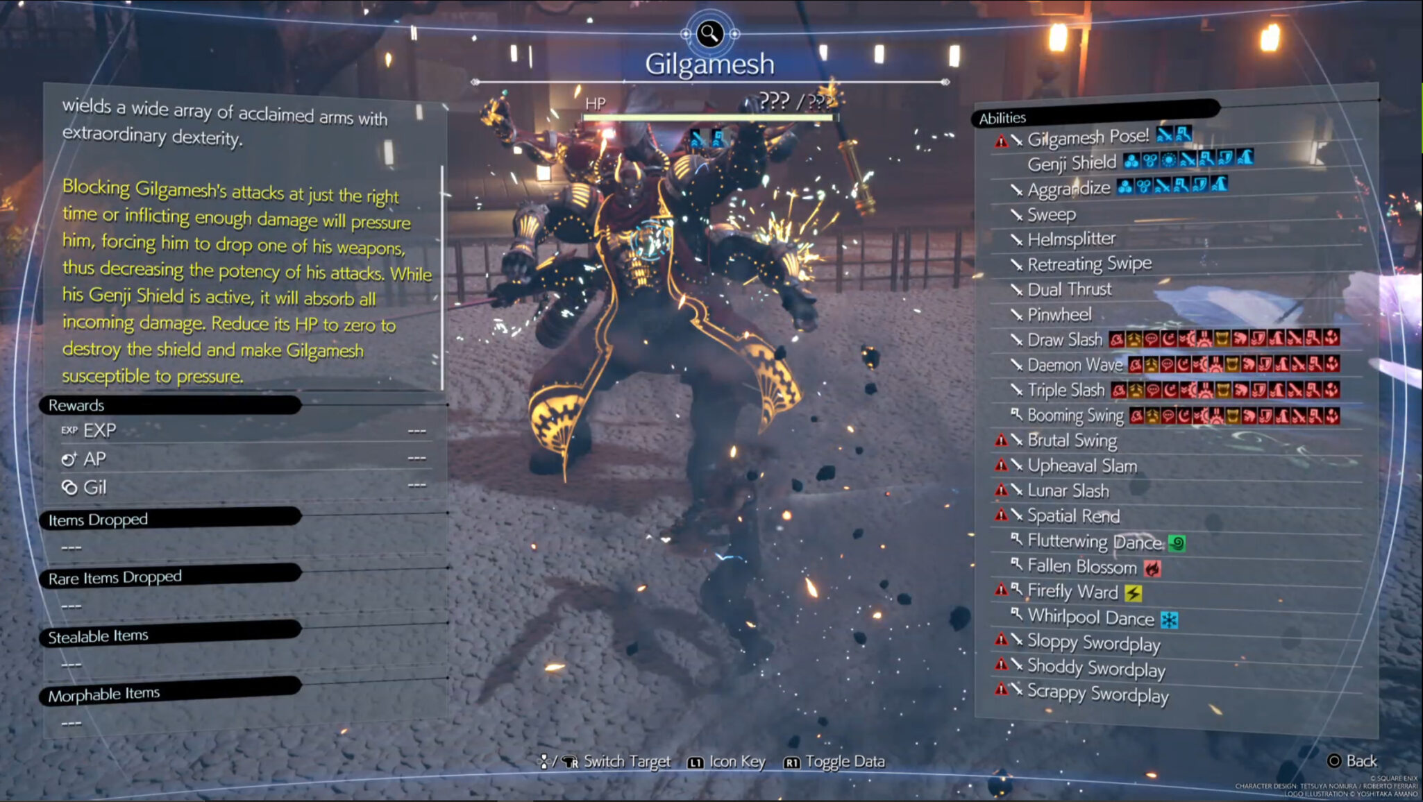 Gilgamesh has a wide array of abilities that deal considerable damage. Throughout the fight, he will summon his arsenal one at a time as his Masamune or Rune Axe. He moves swiftly, making it difficult to block a lot of his attacks. However, successfully blocking his attacks will cause him to drop his weapons and pressure him. He can also use Genji Shield and gain multiple buffs. When the shield appears, destroy it quickly to pressure him and reduce his defense.