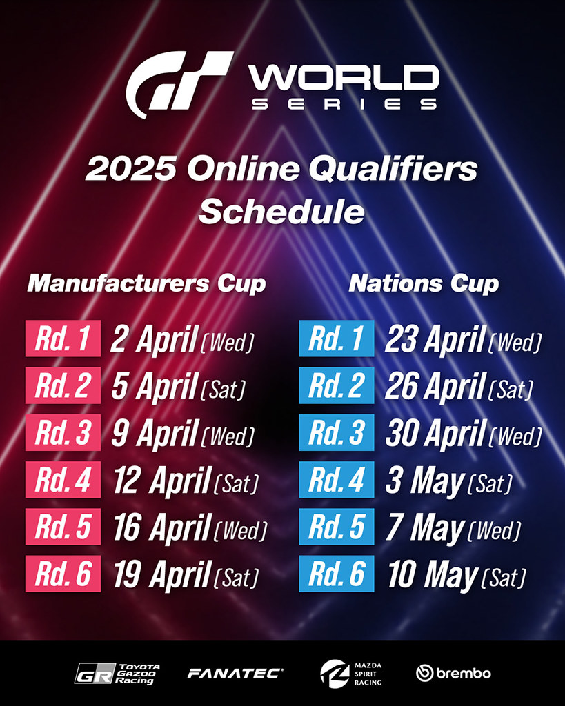 The detailed schedule for this starting set of Gran Turismo World Series 2025 online qualifiers is in the image below. For other details, check out this official page.