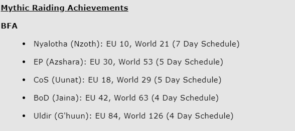 Reason Gaming was a storied guild, but it had only rarely been a full-time raiding guild. Instead, it raided on four or five-day schedules in BFA. This changed for Ny’alotha, where they hit a seven-day schedule. Their reward? EU 10th place and World 21st. While this was nothing to turn your nose up at, it was still nothing close to the world-first pace.