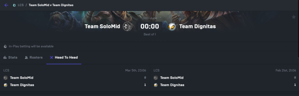 The odds for Dignitas winning this game is 2.64, if you are to put the winnings into an odds converter, it would tell you Dignitas has a 37.9% chance of winning this game which means the odds are great. Not only that, even if you do not that much experience watching the LCS, Midnite’s betting page shows off the team’s stats in comparison as well as their head-to-head record, which showcases Dignitas has beaten TSM both times this season.