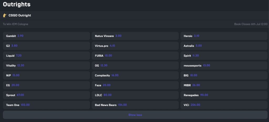 For example if we look at the outright bets available for IEM Cologne, we can see that ahead of the tournament Gambit have the best odds to win the event. Six teams have odds of 5 to 1 or better for IEM Cologne; Gambit, Natus VIncere, Heroci, G2, Virtus.Pro and Astralis. Meanwhile Team One, Bad News Bears and ViCi all have very odds given their unlikelihood to win the event.