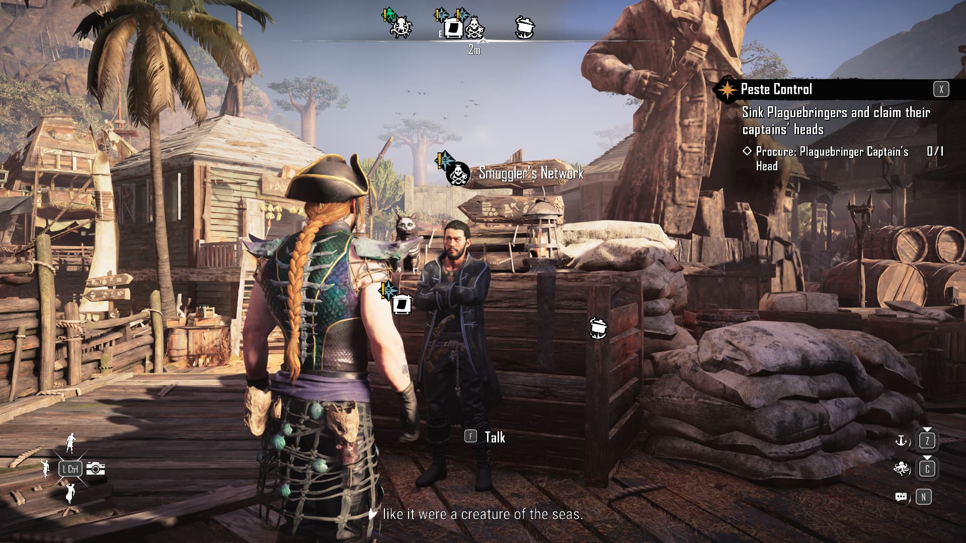 In Sainte-Anne, where you first met him, he is much more out in the open. His appearance in Telok Penjarah, however, sees him wear a mask as he settles down in a small cubby-like area. Talk to him to accept The Encroaching Epidemic in Skull and Bones.
