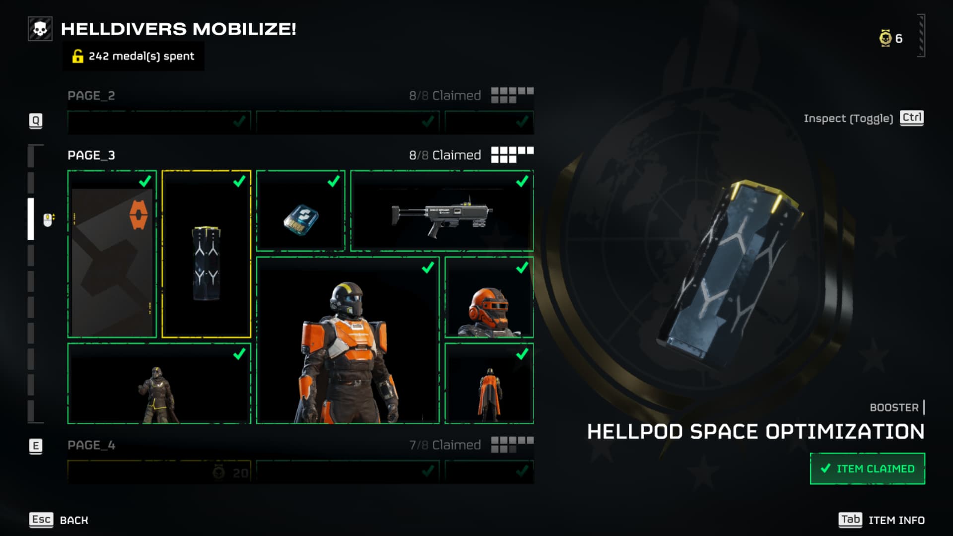 | Hellpod Space Optimization | Warbonds 3 | 15 | Helldivers come out of the Hellpod fully stocked on Ammo, Grenades, and Stims. |
