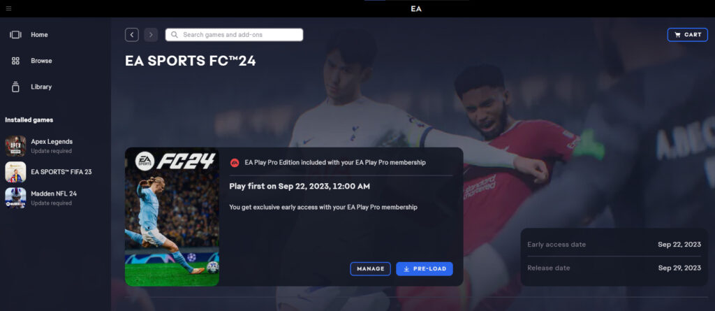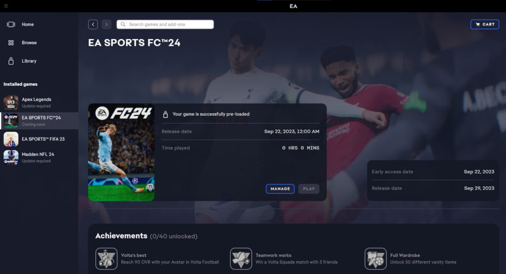 Once you have that installed and are logged in, it becomes insanely easy to preload EA FC 24. The game will automatically appear in your library and all you need to do is hit the preload button next to it. Click “Next” on the next box and the game will then start downloading.
