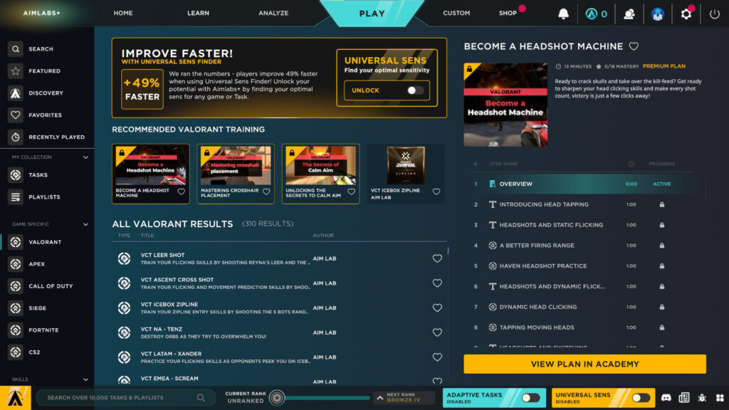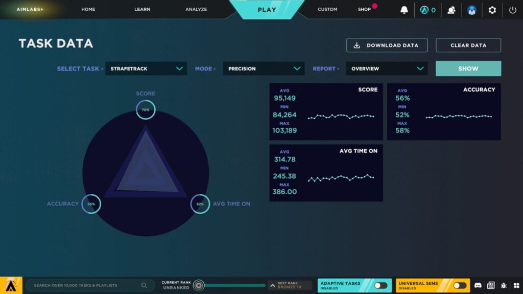 For Kovaaks, there is a training plan you can follow if you want to improve your aim in FPS games. It’s called Voltaic, and they publish a daily improvement plan. This comes complete with difficulty levels, playlists and some logic behind why you’re working on each thing. There is also a spreadsheet that lets you track your progress.