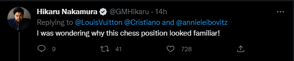 Hikaru Nakamura, reigning World Fischer Random Chess Champion, commented on the photo, “I was wondering why this chess position looked familiar!”
