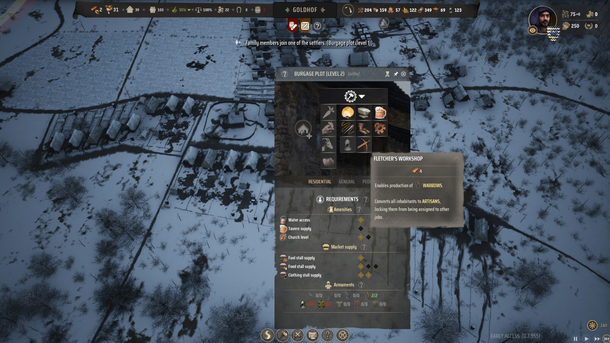 The building blocks of any effective militia are its weapons. Players can build weapons of their own to supply the militia once they have upgraded a burgage to level 2. Once at this level, there will be options to convert those families into artisans who can create bows, shields, and spears for your militia. These are essential to getting started with combat in Manor Lords.
