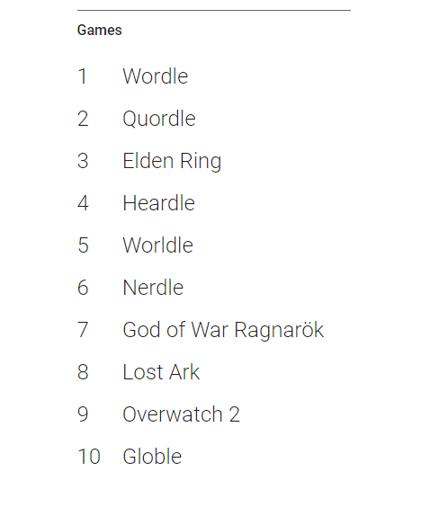 Wordle beat out Lost Ark, Elden Ring, God of War Ragnarök, and countless other AAA titles, to be the most searched game by a country mile. What’s more, Wordle clones dominated the list as well. Song guessing game Heardle, quote guessing game Quordle, geography guessing game Worldle, and others make up over half the top 10 most searched games.