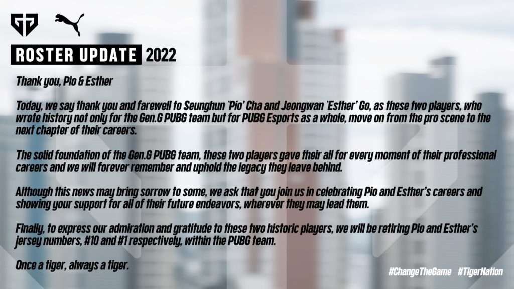 As a part of their announcement, Gen.G announced that the jersey numbers for both players would be retired. Pio has announced that his intention is to take a short break before he goes for military service. On his stream, he actually revealed that PUBG themselves asked him to reconsider retirement, showing just how much of an icon he was to the game.