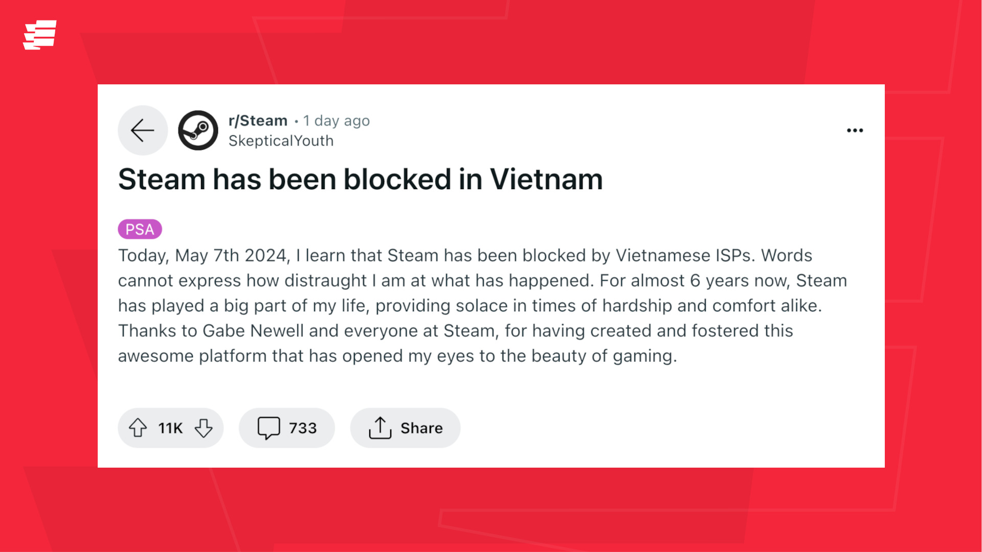 According to various posts online, Steam appears to have been banned in Vietnam as of May 7. Vietnamese users on Steam forums, Reddit, and other social media platforms state that their internet service provider (ISPs) are completely blocking access to the platform.