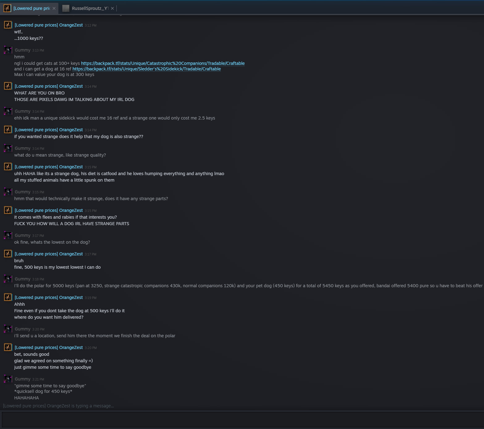 First, both OrangeZest and Gummy are very reputable and experienced traders. The former’s TF2 inventory is worth just over $10,000 (not including dog) while the latter has over $33,000.
