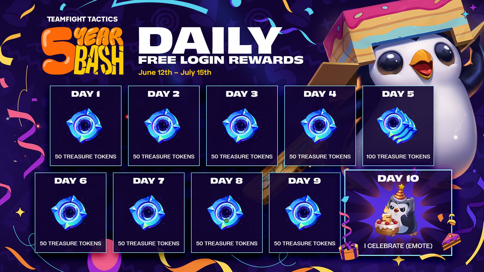 To celebrate five years of TFT, the game is offering 10 days of free login rewards to players who simply log in between June 12 and July 15. Each day will offer a different amount of Treasure Tokens. The final day will reward players with an “I Celebrate” emote with an adorable 5-year birthday cake featured. But, this isn’t all.