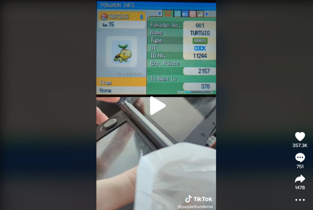 On September 28, Purple Thunder uploaded a TikTok where he bought every used copy he could find at a local GameStop to see any saved profiles left behind. He ended up with a $76 copy of Pokemon Pearl for the 3DS with a peculiar save file.