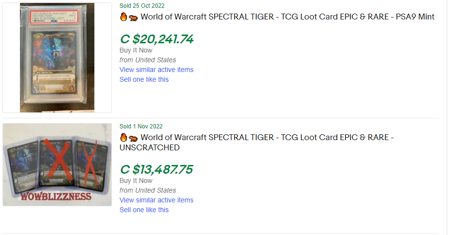 The advent of eBay and general greed led to a majority of the WoW TCG loot cards becoming white whales. Prices from third-party resellers veer up into the thousands and tens of thousands for the most rare of loot cards, such as the coveted Spectral Tiger card, which gives one of, if not the rarest mount in World of Warcraft.