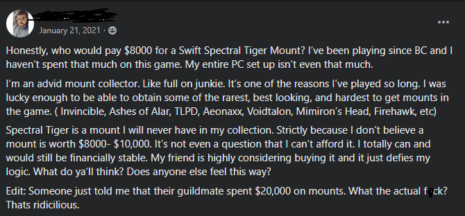 As you can imagine, it came with a bit of controversy in mount collector circles when Blizzard announced that one of these rare mounts, the Feldrake would be a Twitch drop during the Dragonflight promotion period. Players that had bought a Feldrake for up to three thousand dollars are mad that their speculation purchase now amounts to nothing, while reseller sites stand to have their cardboard gold turn to dust once the promotion is live.