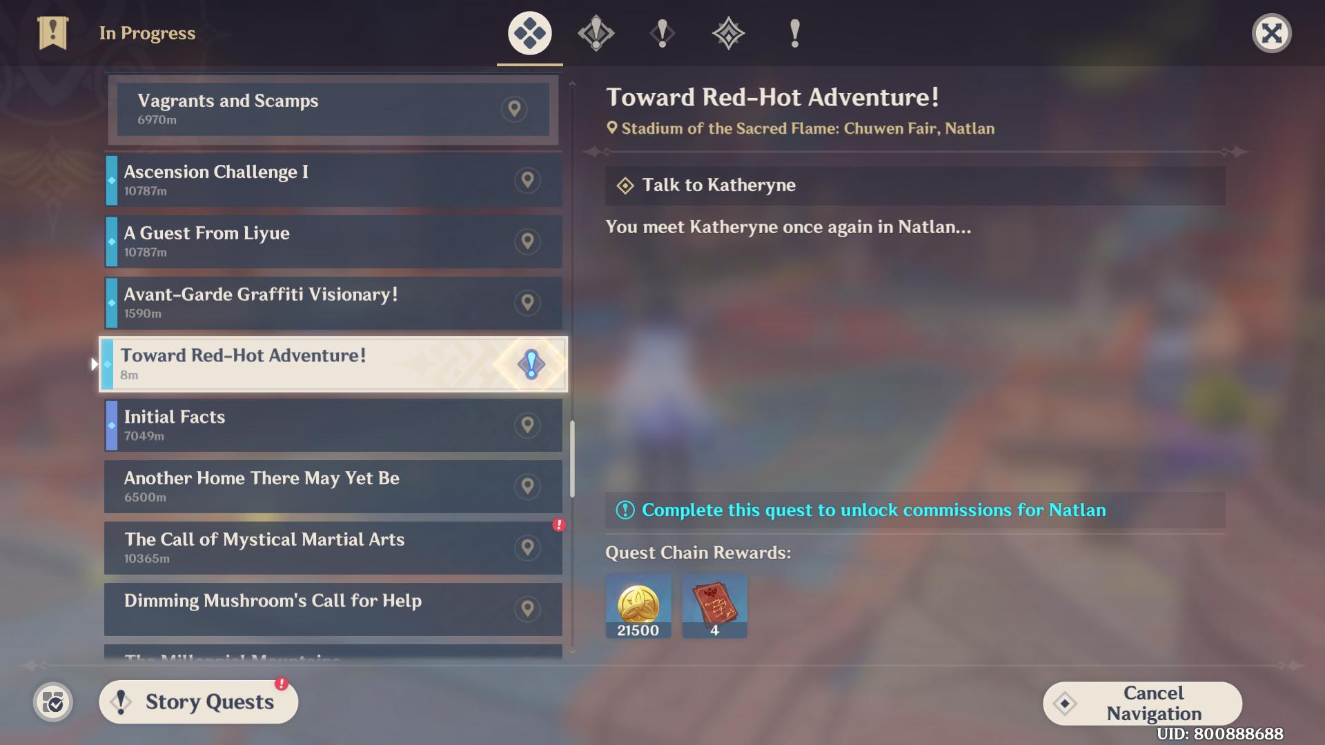 - Complete the side quest “Toward Red-Hot Adventure!” by talking to Katheryne in Natlan.