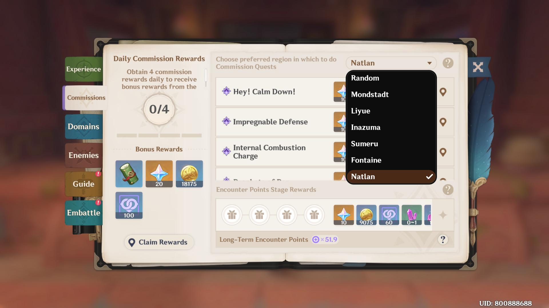 To begin getting the dailies in the region, head over to your Adventure Handbook’s Commission tab and change the drop-down in the top-right to “Natlan.” As with the other regions, Natlan Daily Commissions also feature unique and hidden achievements. Have fun looking for them!