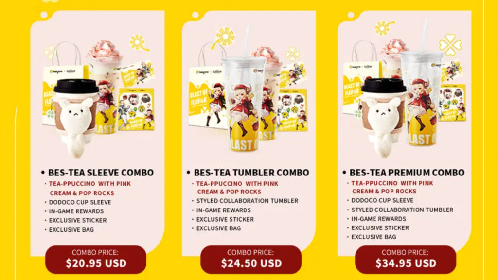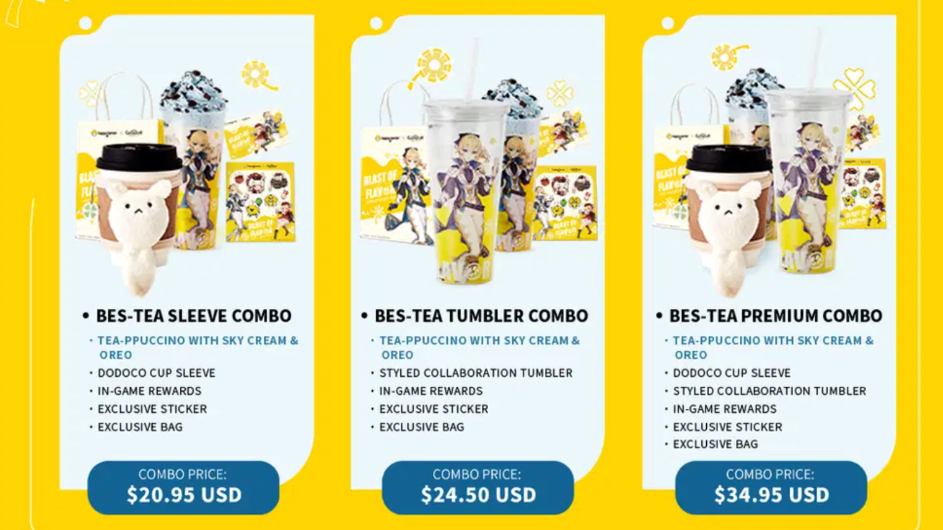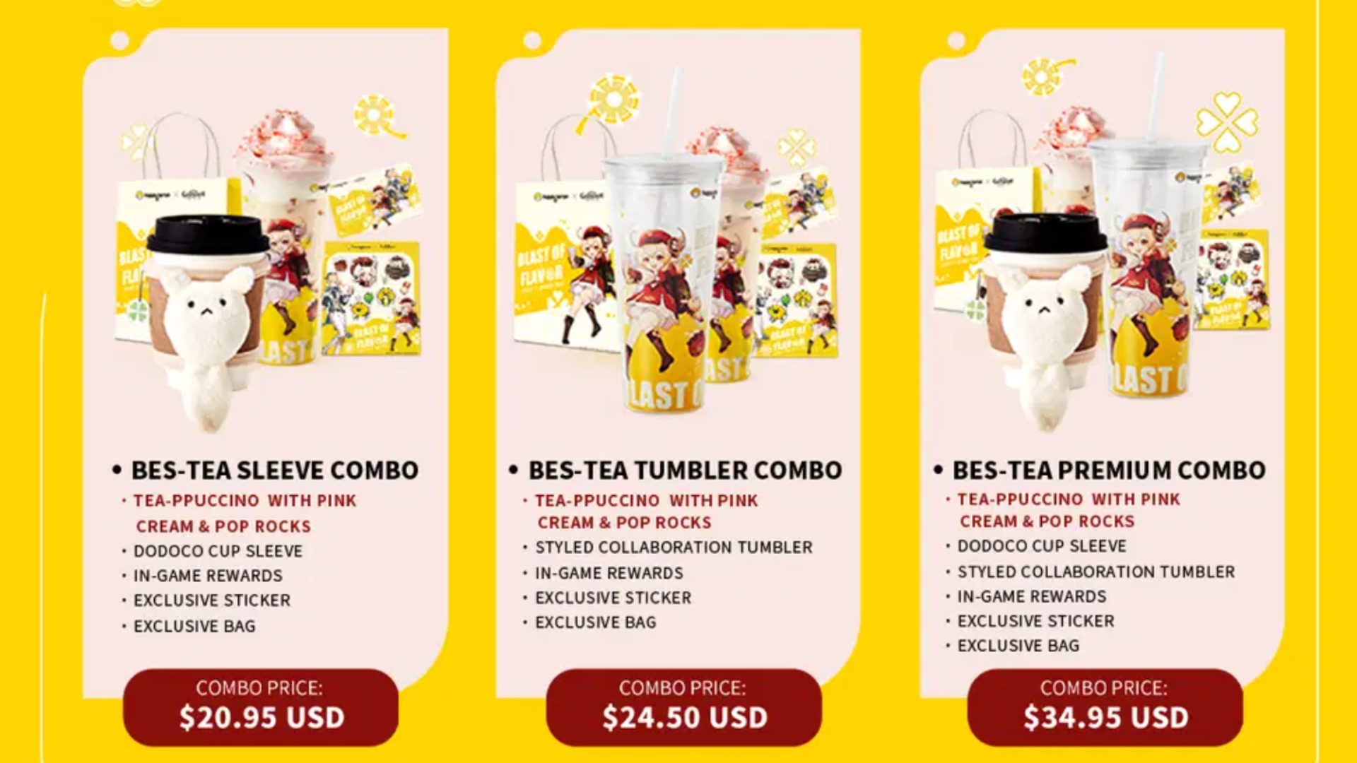 In the Klee one, the Bes-Tea Sleeve Combo costs $20.95 and includes a tea-ppucino with pink cream and pop rocks, a Dodoco cup sleeve, in-game rewards, exclusive stickers, and the paper bag. The Bes-Tea Tumbler Combo includes everything the other does more of a style collaboration Tumbler – it costs $24.95. The last option called the Bes-Tea Premium Combo, includes everything from both the Bes-Tea Sleeve Combo and the Tumbler Combo. It costs $34.95.
