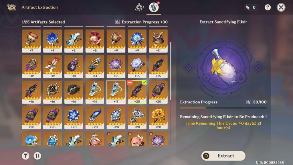 It only accepts 5-star Artifacts that are at least level +4. Once enough Artifacts have been offered, you will receive 1 Sanctifying Elixir, and the offered Artifacts will be destroyed. This exchange has a limit of 1 per cycle, giving you 1 Elixir per version update.