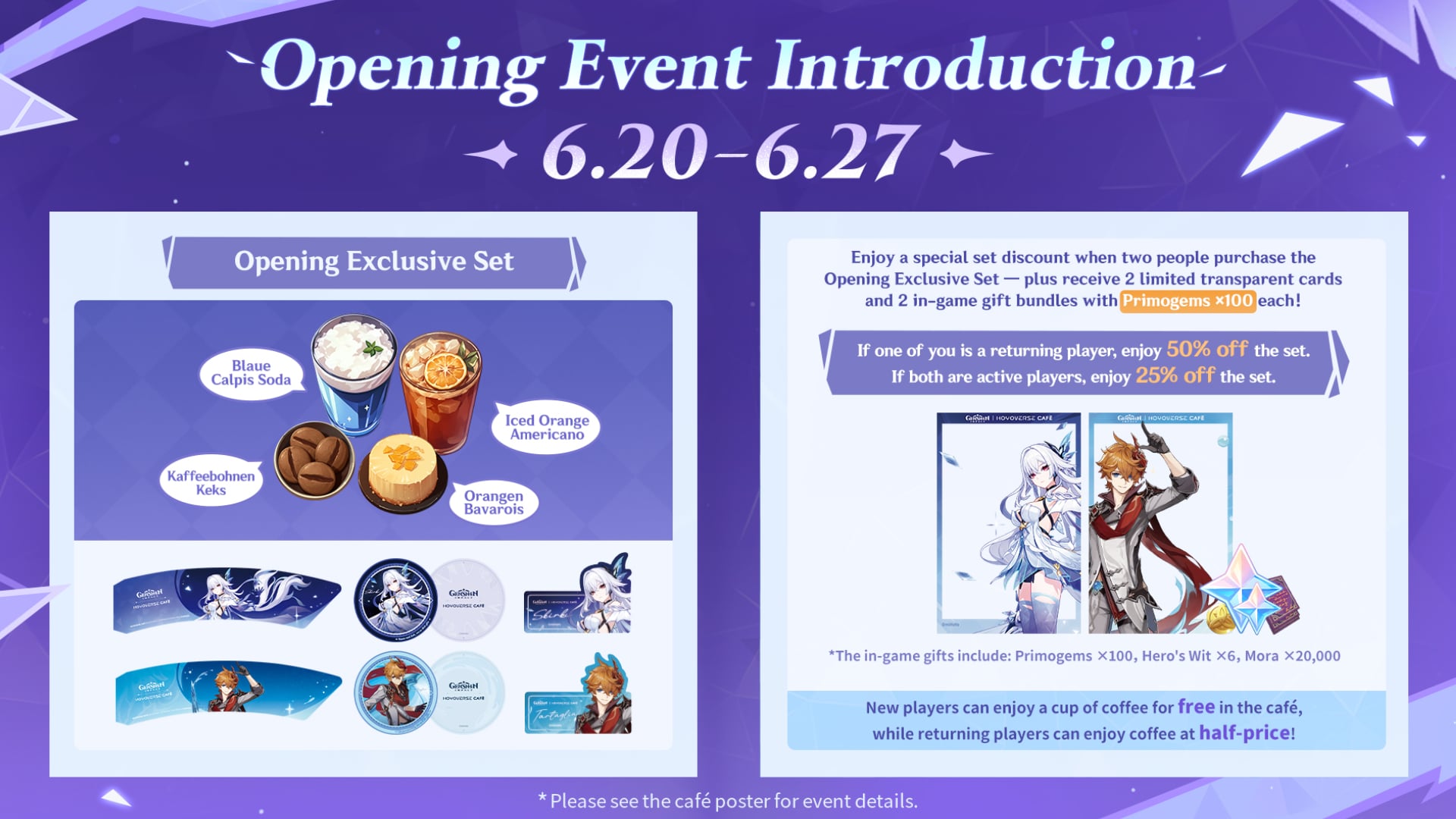 Starting from 10:30 a.m. Berlin time, fans can enjoy a special outdoor opening performance featuring a Genshin Impact-themed string quartet and a street dance show. The café will officially open at 11 a.m., with surprise giveaways happening throughout the day. Plus, popular cosplayers Taryn and hyoga.x will be making special appearances as temporary café managers from June 20 to June 22.