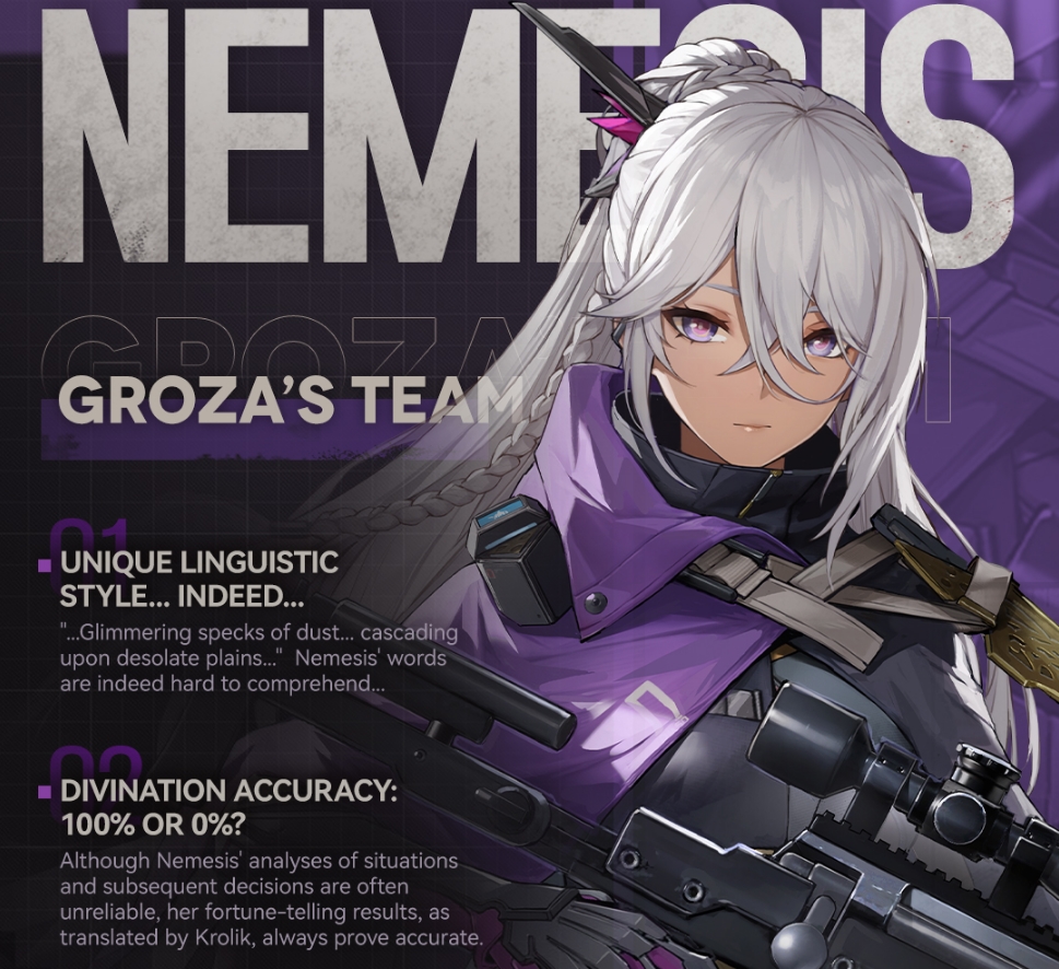 - A Hardcore Occult Geek: Nemesis is never seen without her divination tool, the Prism, and enjoys gathering materials related to mysticism. Wherever the mysteries of the unknown are whispered, there’s Nemesis.