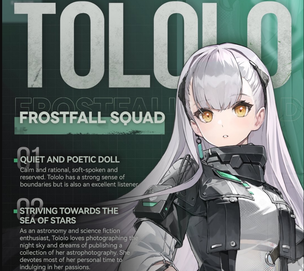 - Quiet and Poetic Doll: Calm and rational, soft-spoken and reserved. Tololo has a strong sense of boundaries but is also an excellent listener.