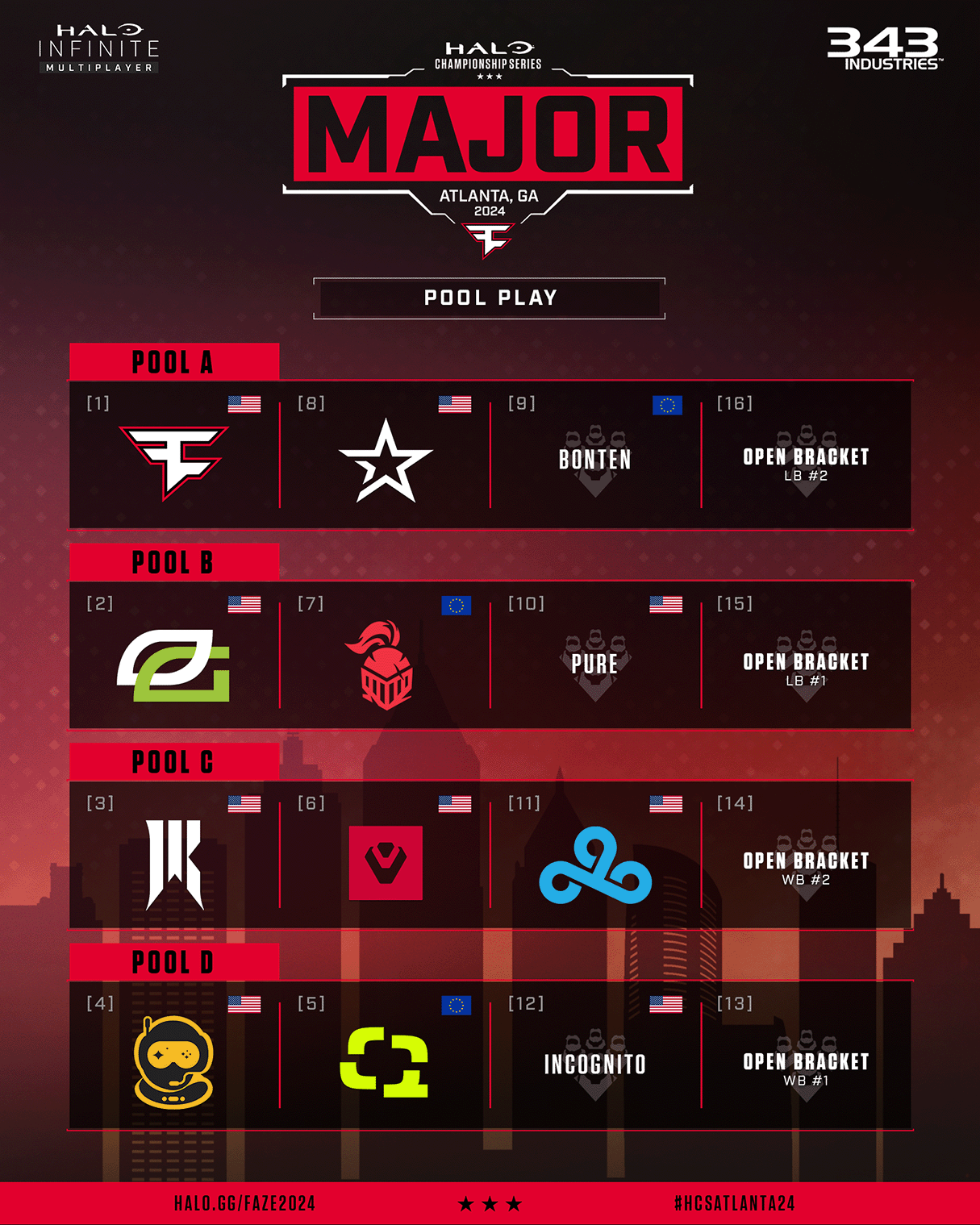 While a 64-team Open Bracket occurs, 12 automatically invited teams wait for the Top 4 in their respective pools. The Top 6 squads from the HCS London Major are given the best seeding in their pool. The entire pool play field is as follows: