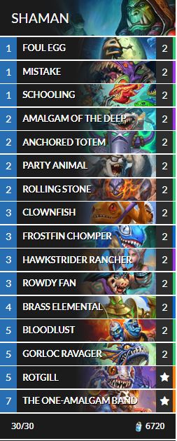 The lynchpin of this archetype is Frostfin Chomper. It’s a three mana Murloc that spawns three tokens if an Elemental was put into play on the previous turn. Cards such as Mistake and Amalgam of the Deep already count as Elementals, but the other Elementals in the list certainly help with synergy. Ideally, this deck likes to swarm the board early and then capitalize on those gains. If not with Bloodlust, then with Rotgill or The One-Amalgam Band as a finisher.