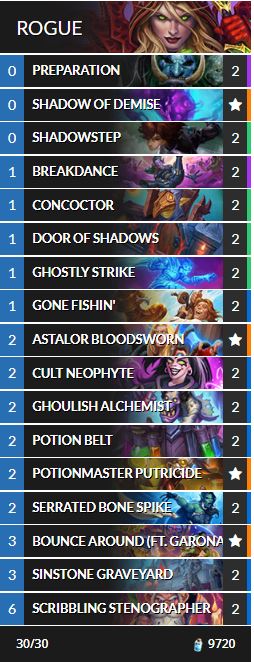 This deck feels reminescent of older Poison Rogue decks of the past. Instead of building a big weapon to swing at your opponent, you constantly improve the damage output of your hero power. Using it to deal lethal amounts of damage before your opponent can muster effective opposition. Cards such as Sunfury Clergy and Treasure Guard help you survive against other aggro decks, though other lists online have cut these for increased aggression.